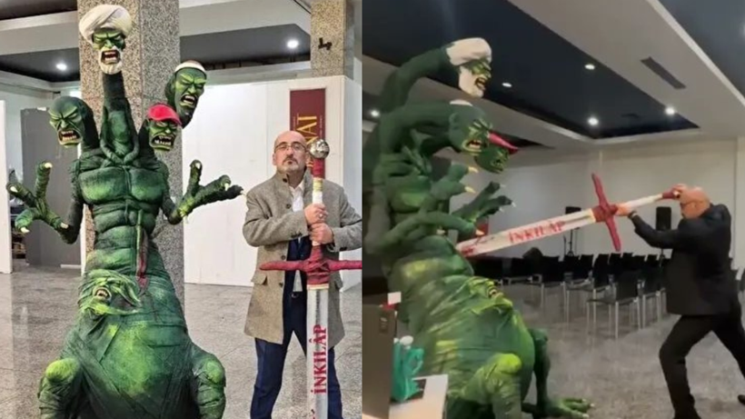 Söz konusu karikatürde Atatürk, “inkılâp kılıcı”nı sarıklı, kızıl şapkalı, çekik gözlü ve saçsız başlara sahip dört başlı bir canavara saplıyor. Bu başların “İslamcı, faşist, komünist ve ırkçı” akımları temsil ettiği ifade ediliyor.