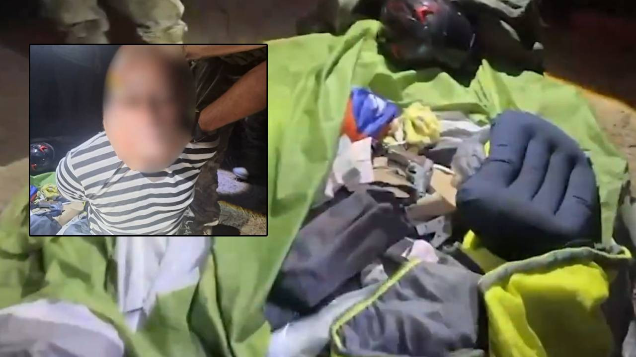 İçişleri Bakanlığı tarafından 'Trabzon'un Beşikdüzü ilçesinde boşanma aşamasında olduğu eşini ikamet ettiği adrese gizlice girerek öldüren ve olaya müdahale eden bir mahalle bekçimizi yaralayan şahıs Sinop'ta yakalandı' notuyla paylaşılan görüntülerde; şüphelinin yakalandığı, çadırda suç aleti tabanca ve desteler halinde bir miktar para olduğu yer aldı. (DHA)
