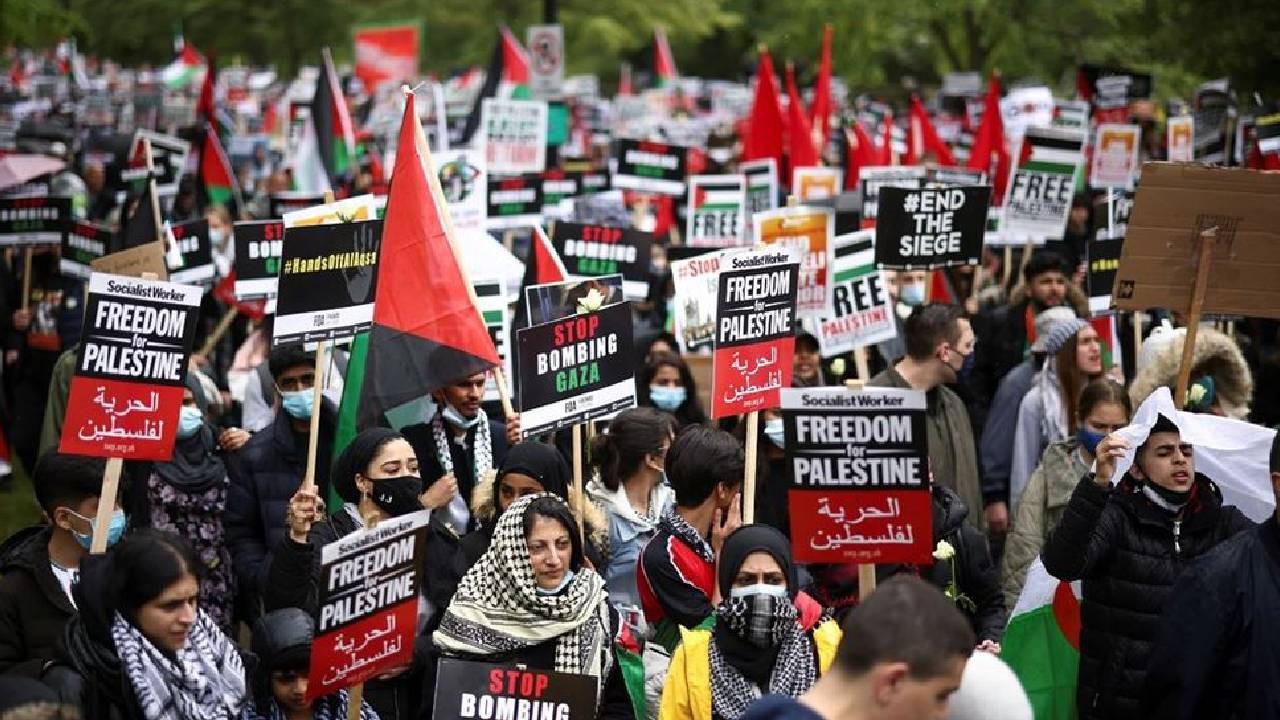 Göstericiler, Filistin halkıyla dayanışma mesajı verirken, İsrail'in Gazze'de sürdürdüğü saldırıların durdurulmasını talep etti.