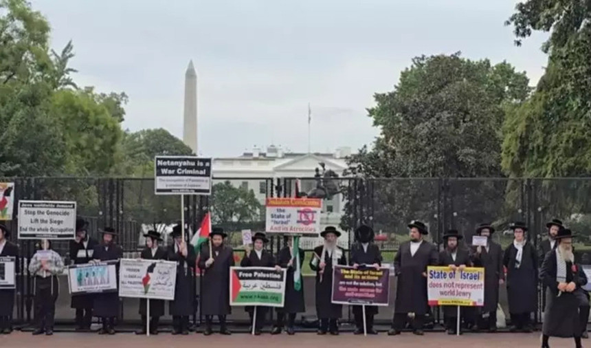 Beyaz Saray önündeki Pennsylvania Caddesi'nde bir araya gelen göstericiler, ellerinde İsrail saldırılarında öldürülen Filistinlilerin ve İsrailli esirlerin fotoğraflarını taşıdı.