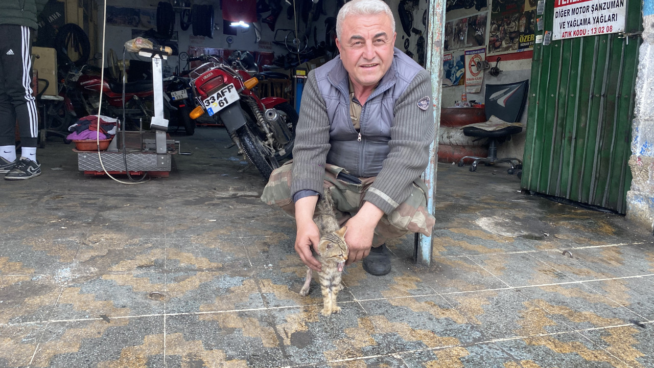 Alaşehir'de yaşayan ve motosiklet tamirciliği yapan İbrahim Aydın, iş yerine giren yaralı kediyi tedavi ettirip bakımını üstlendi.