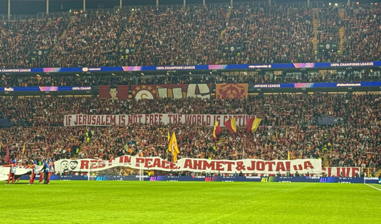Ayrıca Sarı-Kırmızılı taraftarlar, kale arkasına yer alan bölümde "Rest In Peace Ahmet & Jota" pankartı açtı.