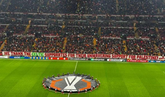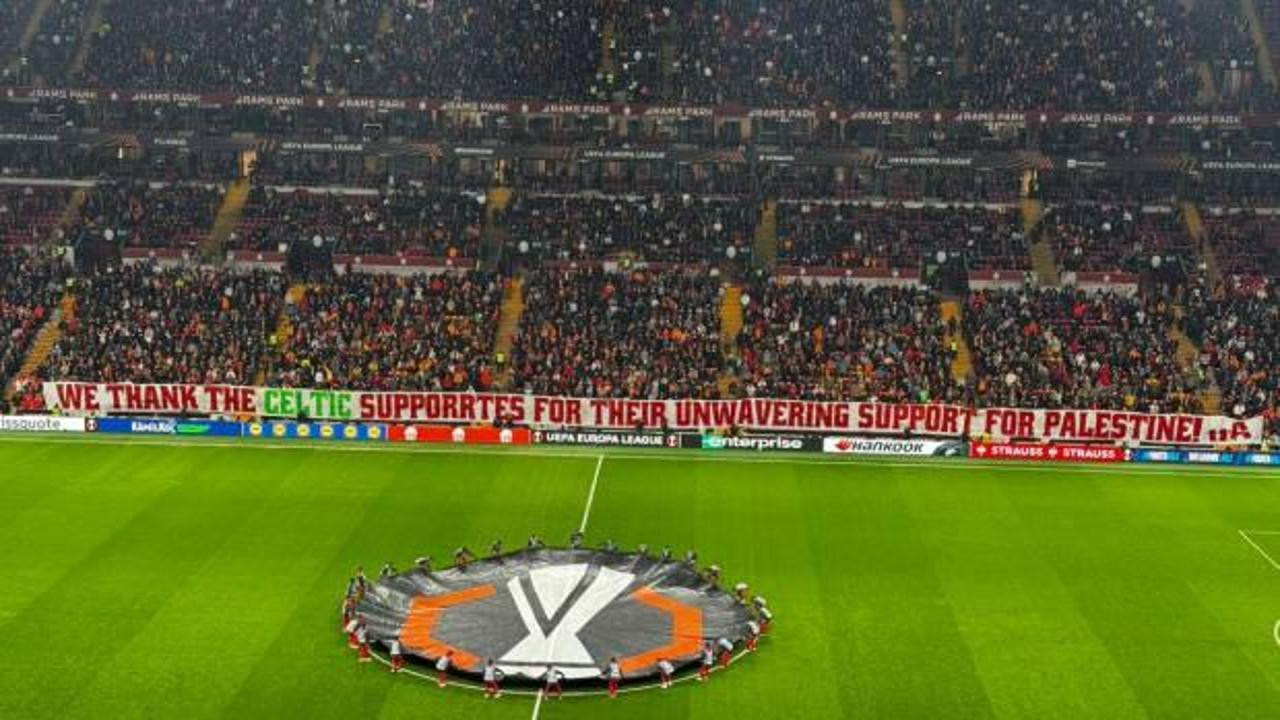 Galatasaraylı taraftarlar, Doğu Tribünü’nde açılan pankartta, “Filistin’e olan sarsılmaz destekleri için Celtic taraftarlarına teşekkür ediyoruz” ifadelerine yer verdi.